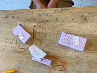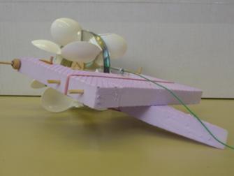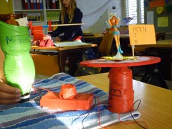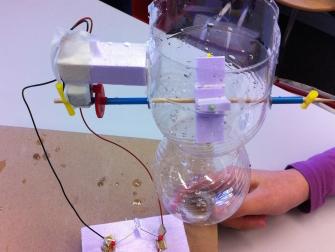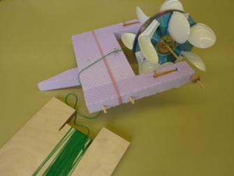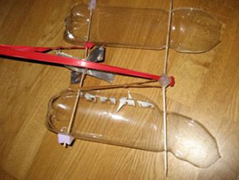 Isabelle hat das Prinzip der Achslagerung beim Wasserkraftwerk übernommen und aus PET-Flaschen und Tetrapack ein Boot gebaut. Die Folienbeschichtete Milchpackung wurde mit Zahnstochern so verstärkt, dass sie im Kreuz angeordnet ein Antriebsrad bildet. Der Gummizug wirkt auf die Achse, die wie beim Wasserkraftwer ins PET eingelassen wurde.