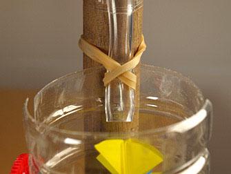 • Mit einem Gummiband und einem Distanzhalter kannst du die Richtung des Wassers verändern (Distanzhalter: Ein Grillspiesschen und aufgeschnittene Trinkhalmstücke in einem roten Trinkhalm).
