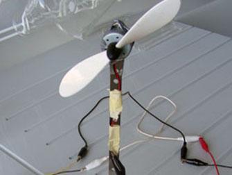 Arno hat verschiedene Flugzeugpropeller ausprobiert, um den Generator mit Luft in Bewegung zu bringen. Mit einem grösseren Gebläse konnte er sogar einen Summer zum Tönen bringen. BRAVO Arno!