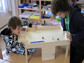 "Zuerst haben wir ein Tor rausgeschnitten, dann haben wir die Eckfahnen konstruiert. Für den Balleinwurf haben wir den vorderen Teil einer PET-Flasche verwendet. Das Spielfeld haben wir im Internet ausgedruckt. Wir haben auch noch eine Anzeigetafel und Punktezähler gemacht."