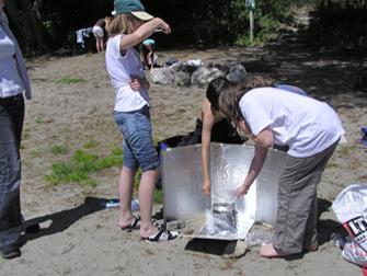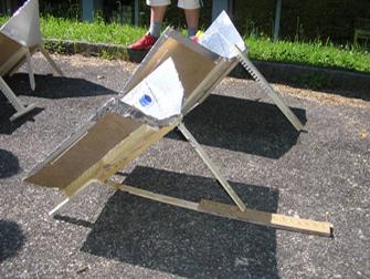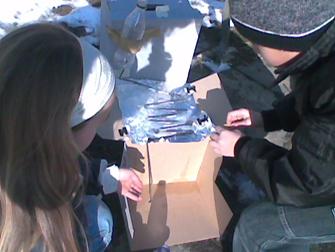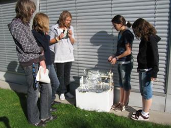 Mädchen aus der Klasse von Paul Rohner haben ihren Solarofen in Position gebracht. In der Styroporkiste, welche mit Spiegelfolie ausgekleidet ist und durch ein Glas oben isoliert wird, befindet sich ein schwarzes Metallgefäss. Was da wohl feines drin ist- die Entwicklerinnen scheints zu interessieren.