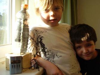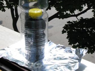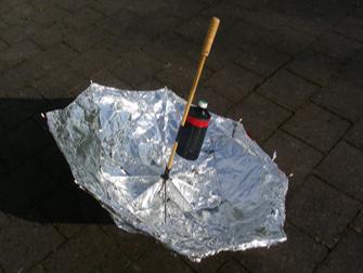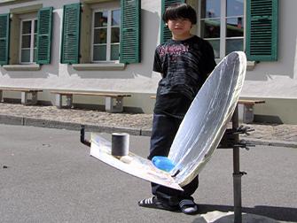 Um die Sonnenstrahlen zu bündeln, haben die Kinder mit ihrem Lehrer Eckhardt Malota die Rückseite der PET-Flasche mit Chromfarbe besprüht. Beim ersten möglichen Versuch mit der Sonne von 9.00 bis 9.15 Uhr am 12.2.''09 wurde eine Erwärmung um 3,5 Grad (von