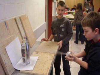 Einige Schüler teilten in Längsrichtung die äussere Flasche (Bild oben), andere klebten sie zum Besprühen ab (Rechts). Beim Zerschneiden müssen die Teile mit Heisskleber wieder zusammengefügt werden. Die Variante mit "aussen besprühen" funktioniert aber auch gut und ist weniger aufwändig zum Bauen.
