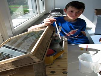 Der Junge aus der Klasse von Paul Rohner misst die Temperatur im Ausgleichsgefäss, das sich auf der Rückseite der Apparatur befindet und über einen Schlauch mit dem Kollektor vorne verbunden ist.