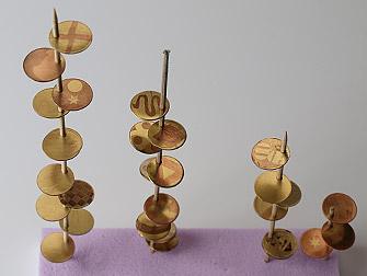 Die Holzspiesschen passen genau in die Löcher  Metallscheiben. So können sie gut getrocknet werden.
