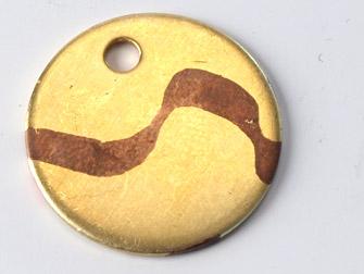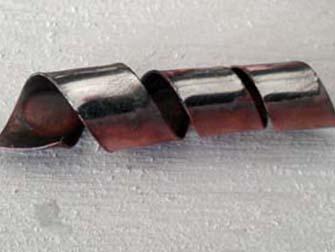 Yannick (12) hat aus Blech mit einer Zange eine Spirale gedreht. Mit Malerklebeband hat er ein Muster abgedeckt und danach die Spirale in die Kupfersulfatlösung getaucht. Die galvanisierten Stellen wurden dunkel und die abgedeckten Stellen leuchten weiterhin hell.