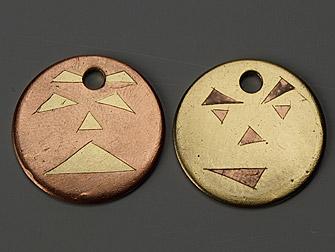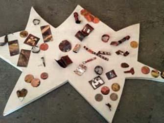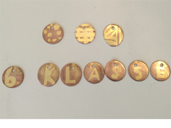 "Auf diesem Bild sind alle Kunstwerke zu sehen, die als Vertiefung zum Thema Galvanisieren entstanden sind. Die Schülerinnen und Schüler haben aus biegsamem Blech verschiedene Formen ausgeschnitten und mit Malerklebband Muster und Buchstaben abgedeckt. Durch Galvanisieren entstanden Ringe, Anhänger und verschiedene dekorative Stücke" schreibt Ursulina Lutz.