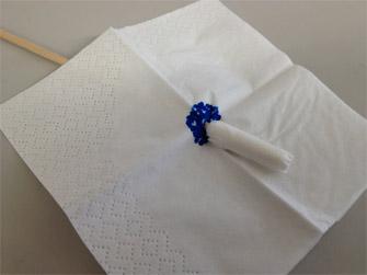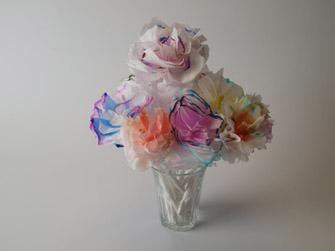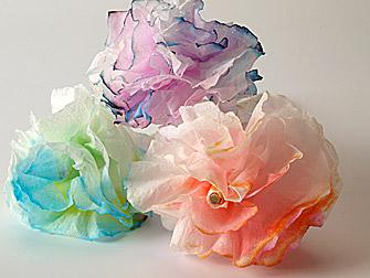 • Wenn deine Blume trocken ist, kannst du die verschiedenen Schichten des Papiertaschentuchs auseindander ziehen. Die Blume wird dann gefüllt, wie im Bild unten.