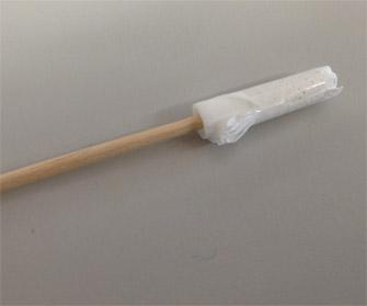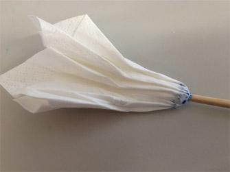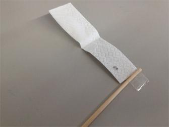 • Mit einem Klebstreifen fixierst du ein kleines Rechteck am stumpfen Ende des Stabes.