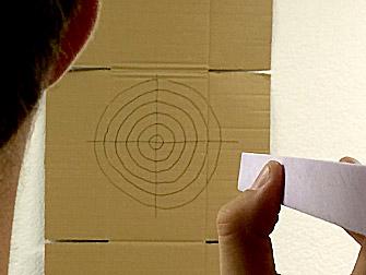 Suche dir eine Zielfläche in ca. 5-6 Meter Distanz. Verändere einen Hartschaumstab so, dass er sicher ins Ziel trifft.
