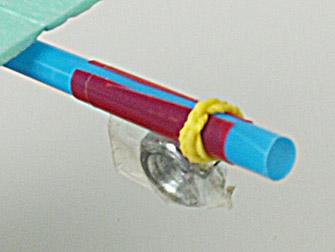 In diesem Foto siehst du, eine mögliche Lösung: Ein passendes Gewicht wird mit Klebeband an einem Stück Trinkhalm befestigt. Dann wird der Trinkhalm aufgeschnitten. Mit einem kleinen Gummiband befestigt, kann man das Gewicht bequem hin und her schieben.