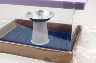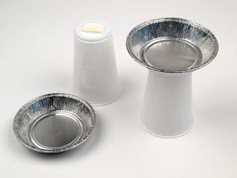 Klebe die Aluschale mit zwei aufeinander gelegten Doppelklebebändern auf den weissen umgekehrten Trinkbecher.