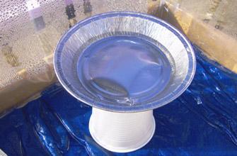 Die Aluschale symbolisiert den Stausee und der umgekehrte Trinkbecher stellt den Berg dar.