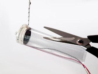 Stosse den weissen Kunststoffteil in den Schlitz des Folienrohres und presse die Folie an die Doppelklebebandstücke.